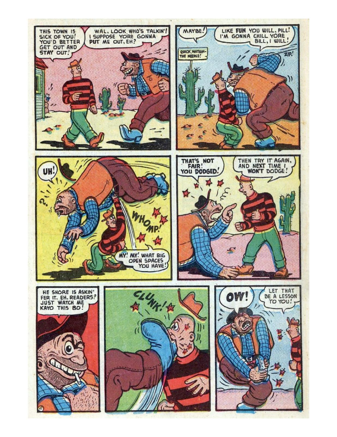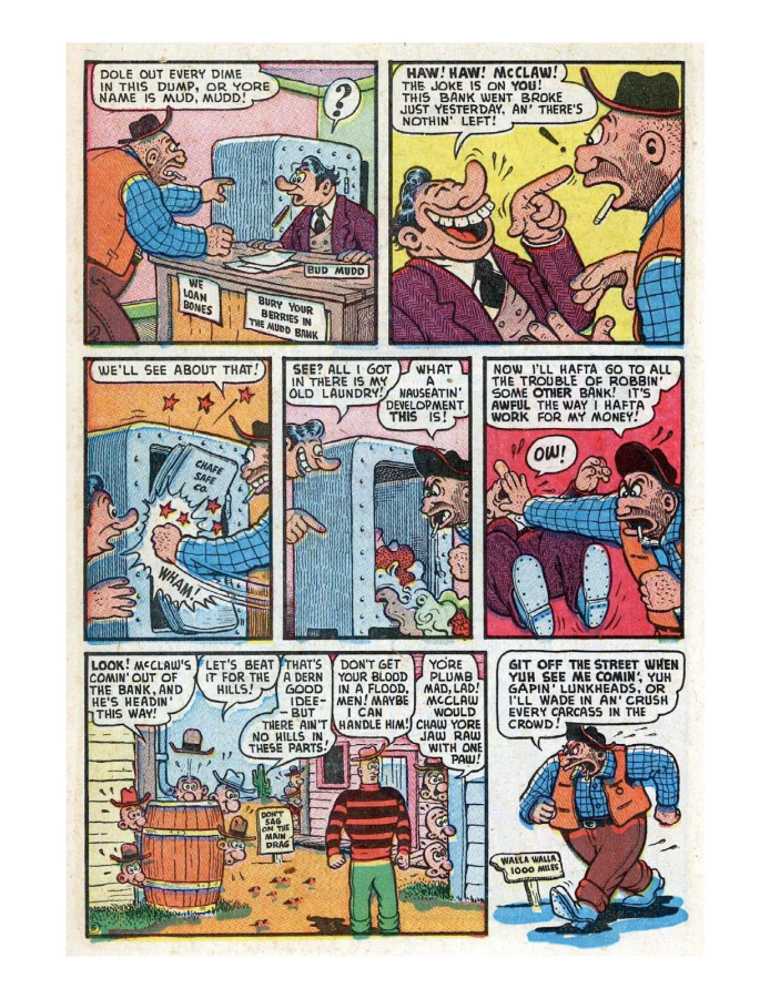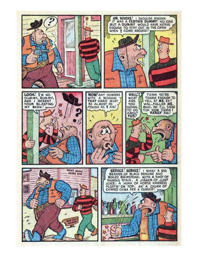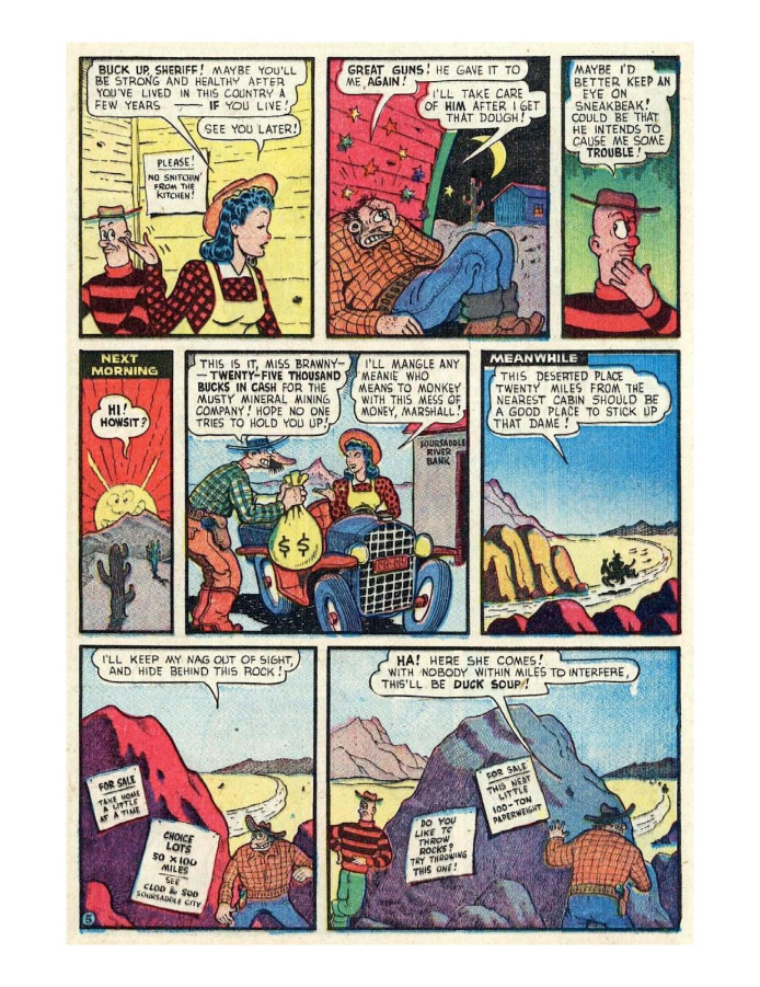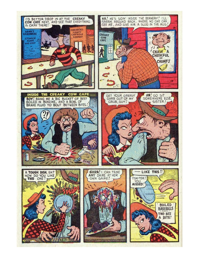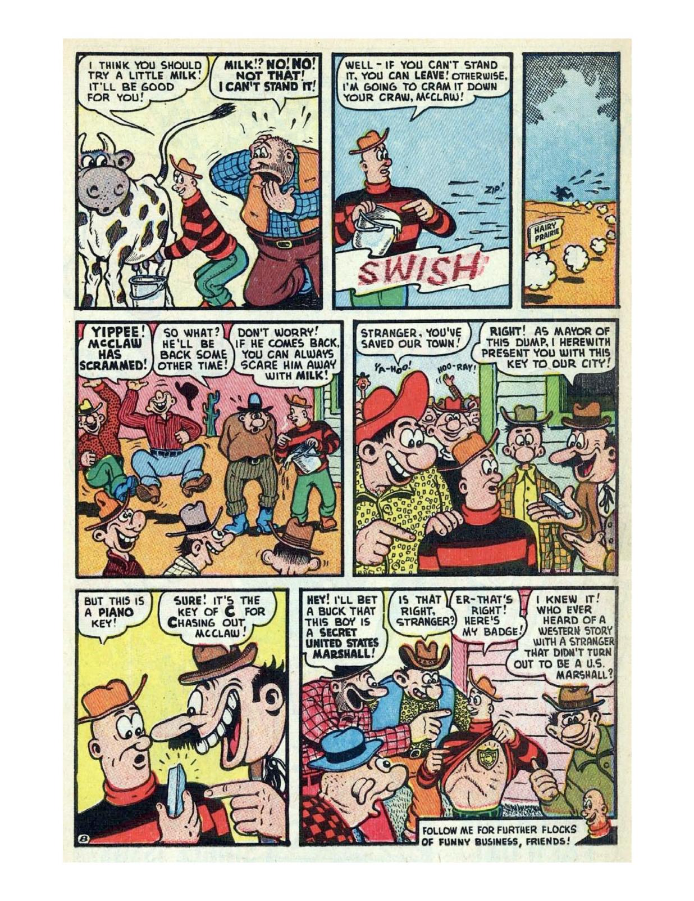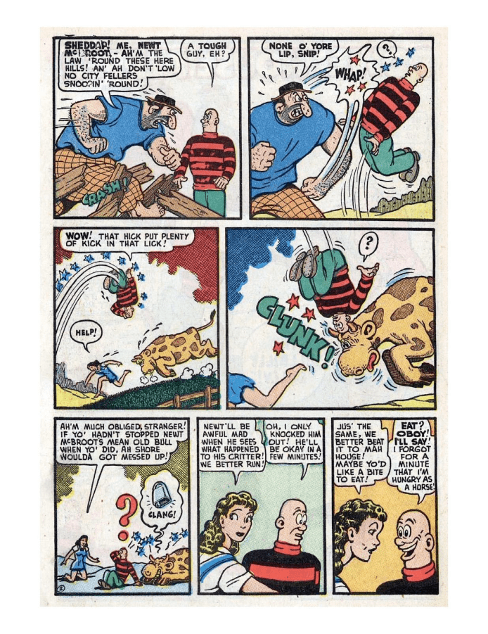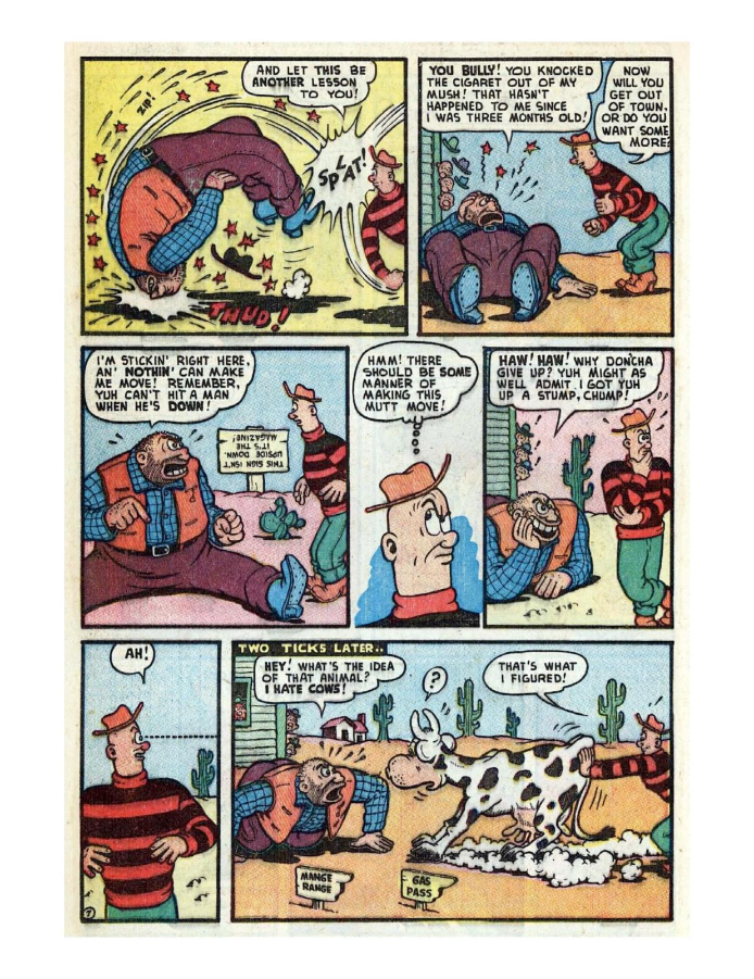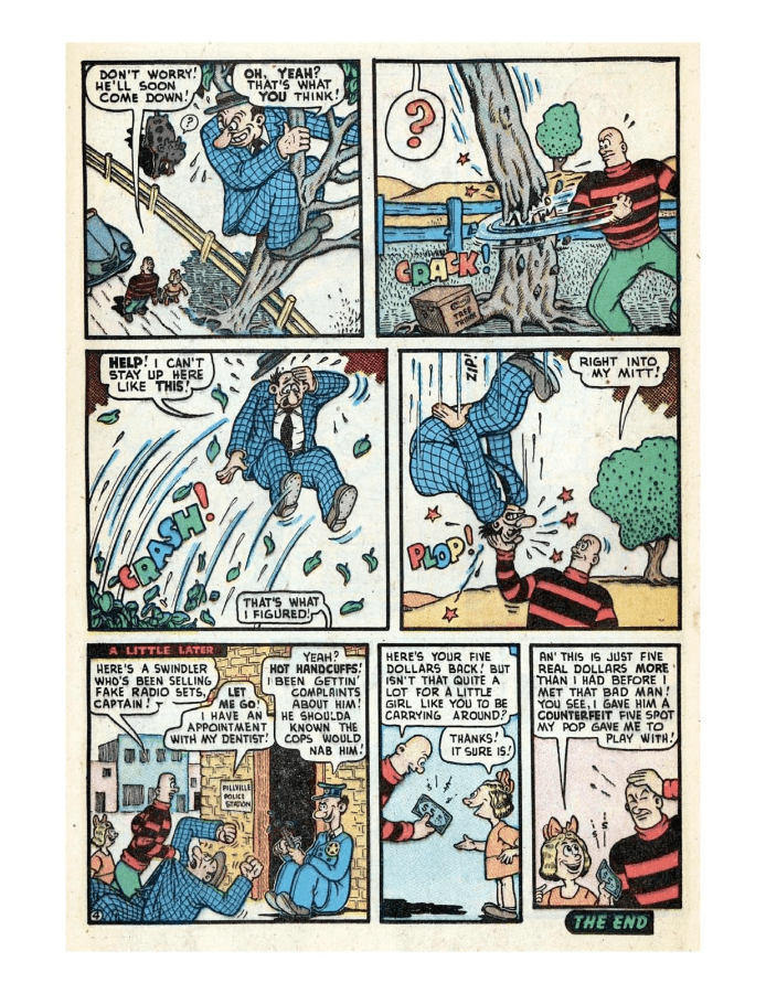 Comic cover with woman holding oversized pen. A hillbilly bullies a man on a horse, leading to a comic confrontation. A comic strip showing a chaotic baseball game with humorous dialogue. Comic strip of two boys arguing and fighting over a toy airplane. Comic strip showing a man dealing with a noisy neighbor and police involvement.