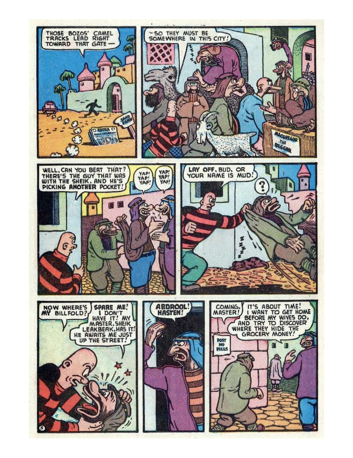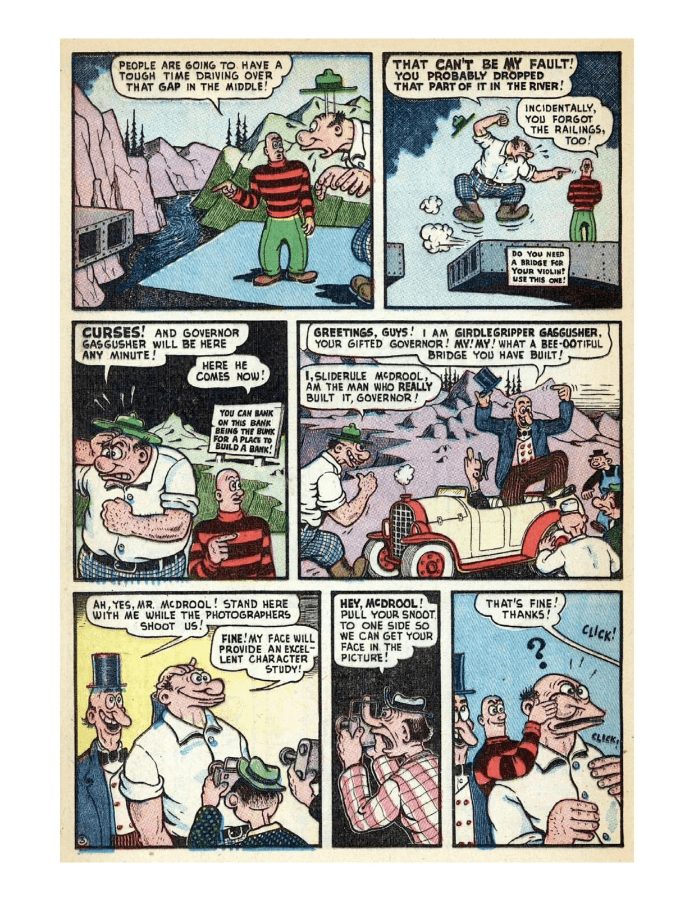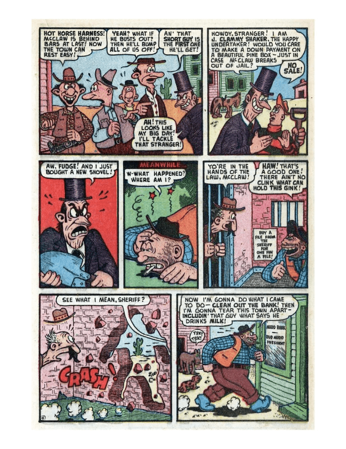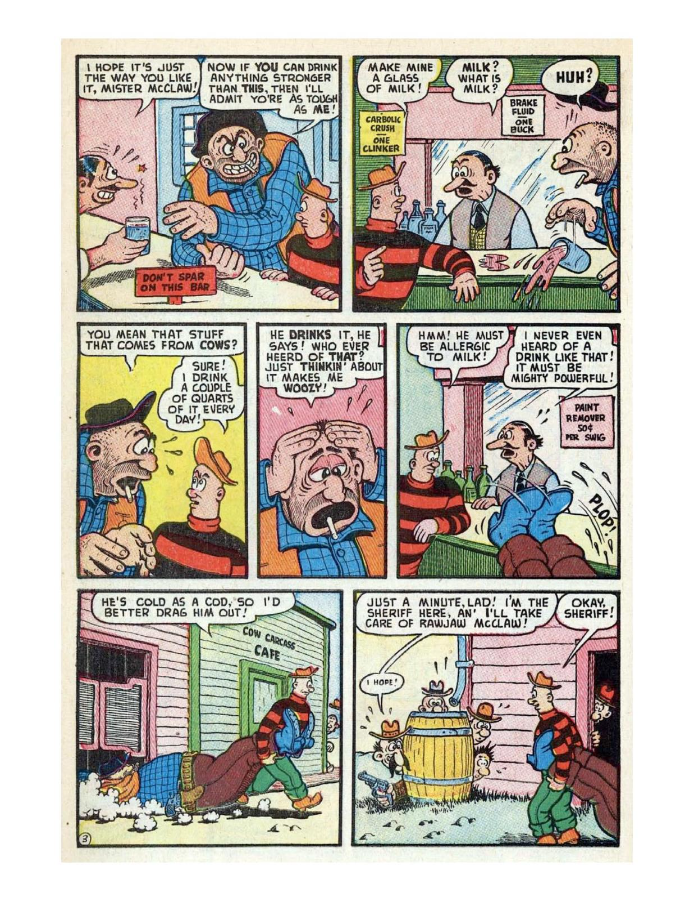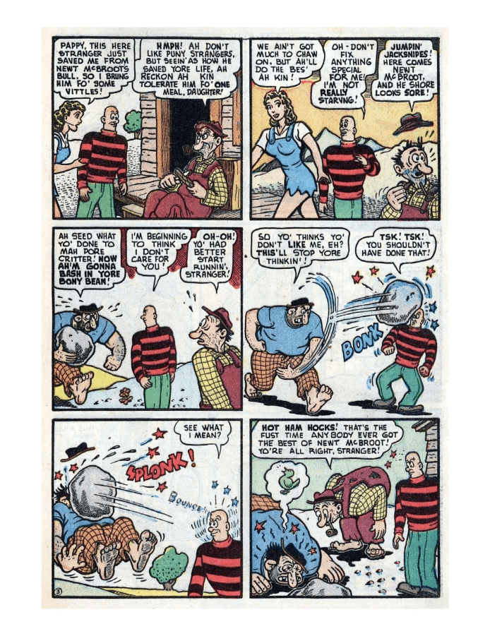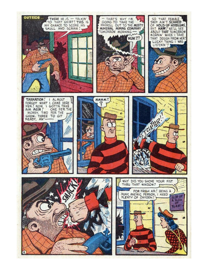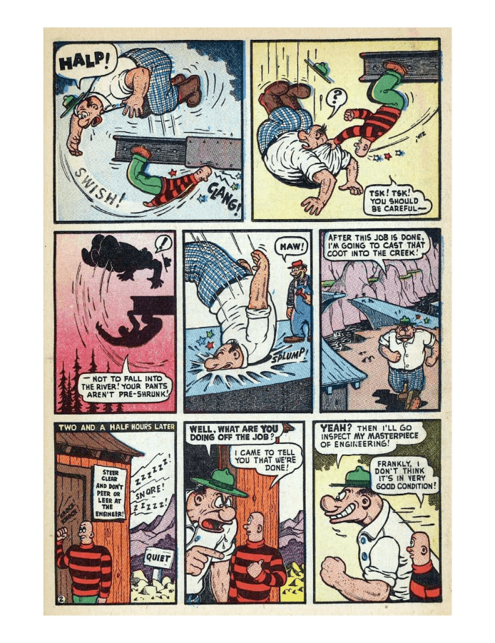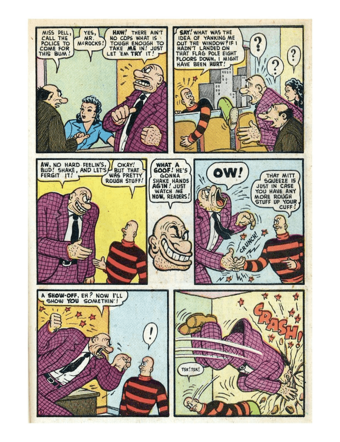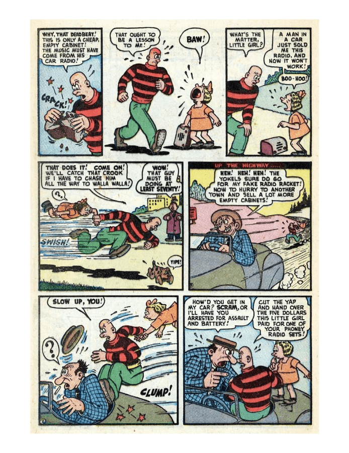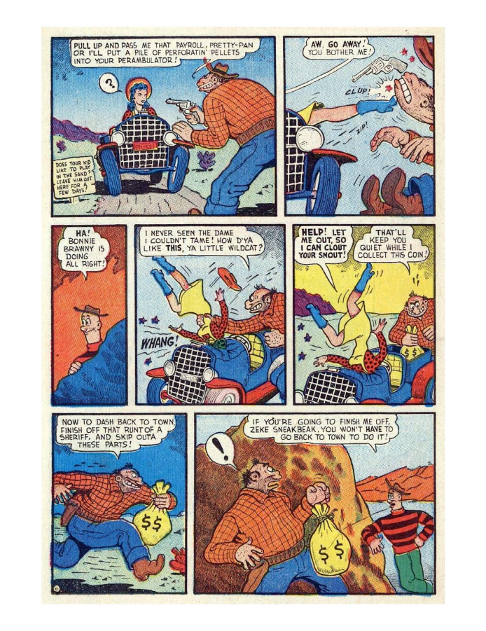 Comic cover with woman holding oversized pen. A hillbilly bullies a man on a horse, leading to a comic confrontation. A comic strip showing a chaotic baseball game with humorous dialogue. Comic strip of two boys arguing and fighting over a toy airplane. Comic strip showing a man dealing with a noisy neighbor and police involvement.