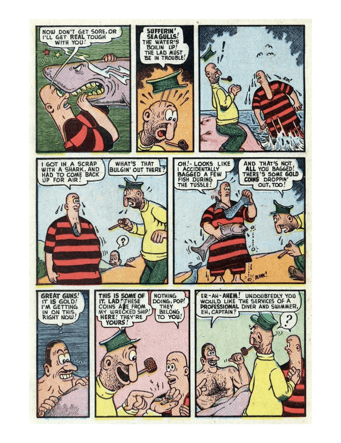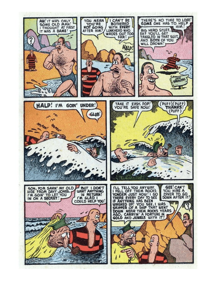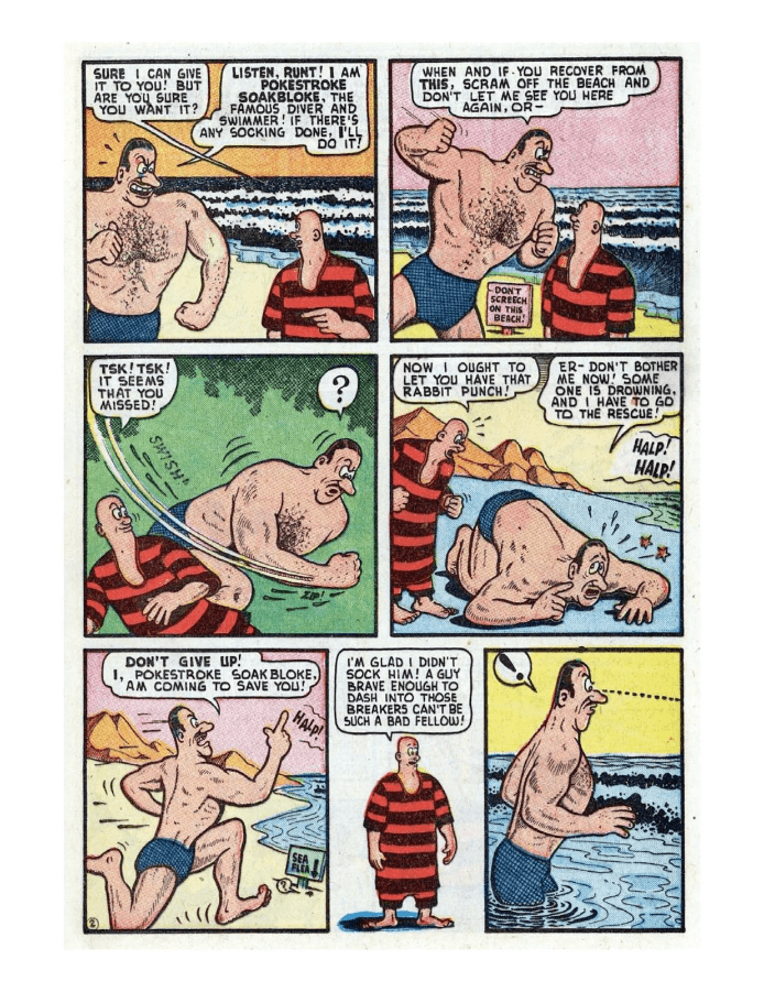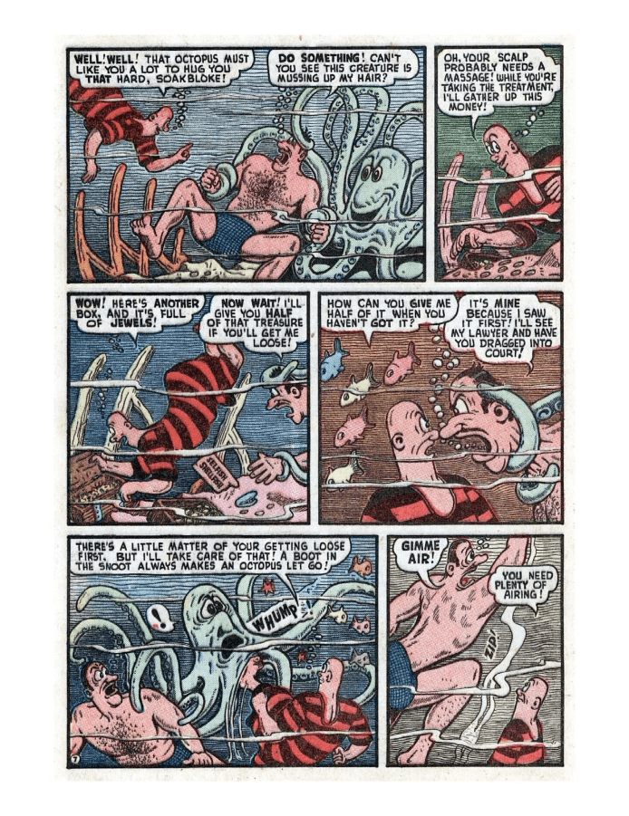 Comic cover: surprised woman with fishing net. Comic strip featuring humorous dialogue among beachgoers. A humorous comic strip showing a man struggling with his oversized belly and attempting various exercises. Sea monsters attack a ship, causing chaos among the crew. A humorous comic strip featuring a bear and a suspicious man. Comic strip featuring humorous dialogue between two characters in a park. Comic strip showing a man rescuing a mermaid from a sea creature. Comic page depicting a chaotic battle between characters in a dark, eerie setting. A comic strip featuring a humorous interaction between a caveman and a dinosaur.
