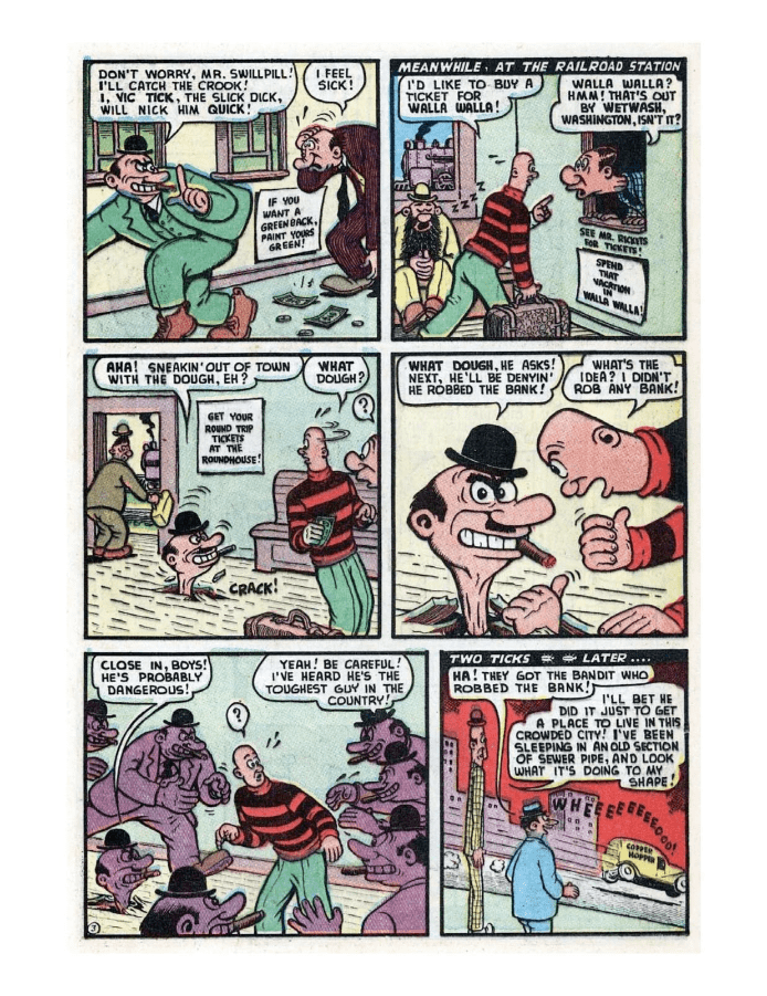 Comic cover: Tessie riding tandem bicycle, typing. Comic strip featuring a man talking on the phone and interacting with a dog. A comic strip featuring a man talking about his job and retirement. A comic strip showing humorous interactions between a man and a pig character. Comic strip showing a detective investigating a suspicious man in a bar. Comic strip showing a man watching TV, getting frustrated, and calling for his wife. A comical comic strip of two men in a humorous encounter. Comic strip with a man, dog, and humorous dialogue about a troublesome dog. A humorous comic strip featuring exaggerated characters and chaotic scenes.