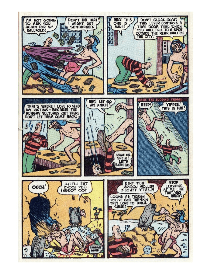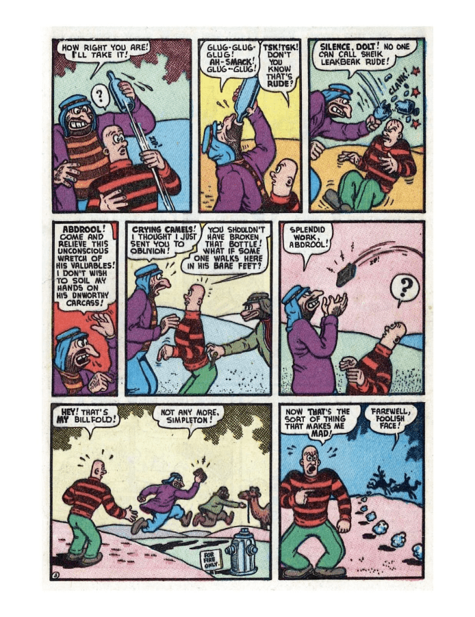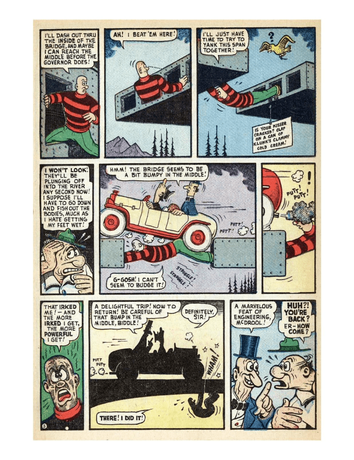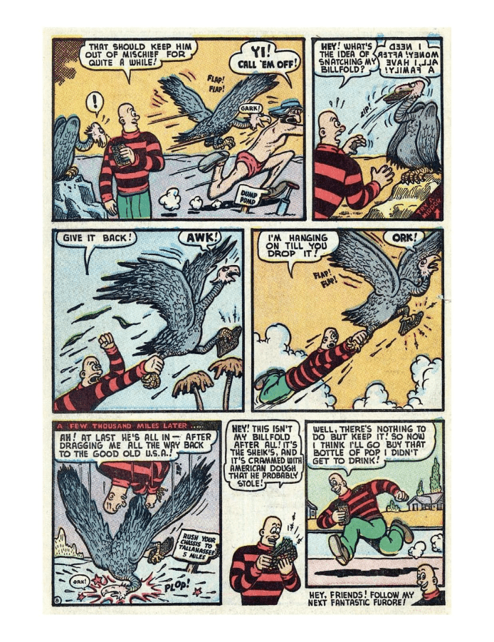 Comic cover: Tessie water skiing, surprised man. Dennis and Gnasher causing mischief in the comic strip. Comic strip showing a humorous conversation between two characters about a mysterious object. A comic strip featuring a man and a woman in humorous interactions. Comic strip showing a man and a striped character interacting with a billboard and a house. A comic page depicting a tense confrontation and a surprising reveal. A colorful comic page showing a chaotic bookstore scene with characters arguing and a man falling. A colorful comic strip depicting a man underwater and interacting with a woman. Superhero battles a giant bird threatening a man in distress.