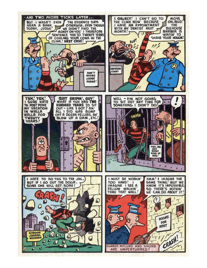 Comic cover: Woman hammering nailed picture of man. Comic page featuring characters in a humorous, chaotic scene involving a pole and pepper. Comic strip featuring a character in various humorous situations with a dog and other scenarios. Comic strip with characters planning a surprise for a friend. A comic strip shows a man's humorous journey through a medical checkup and hospital stay. Comic panels showing a man in a red car performing stunts and evading capture. Comic strip showing a character struggling with muscle building and using a cream.