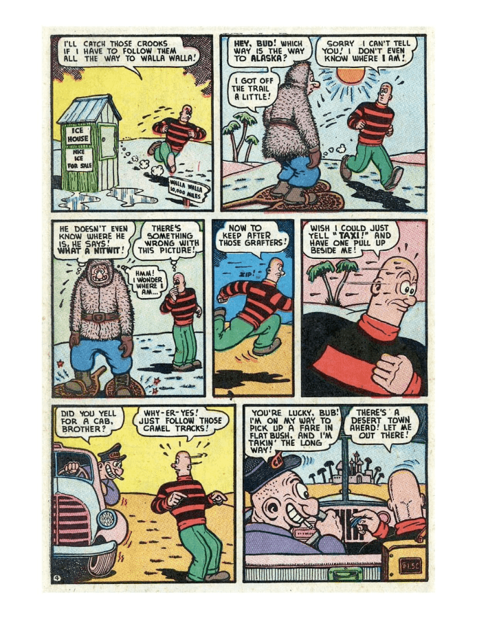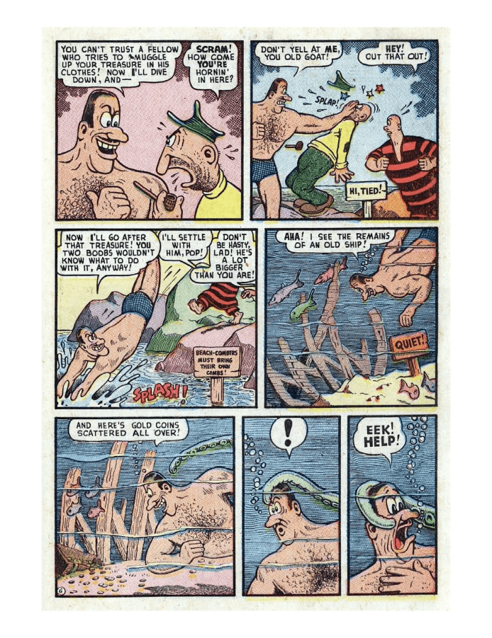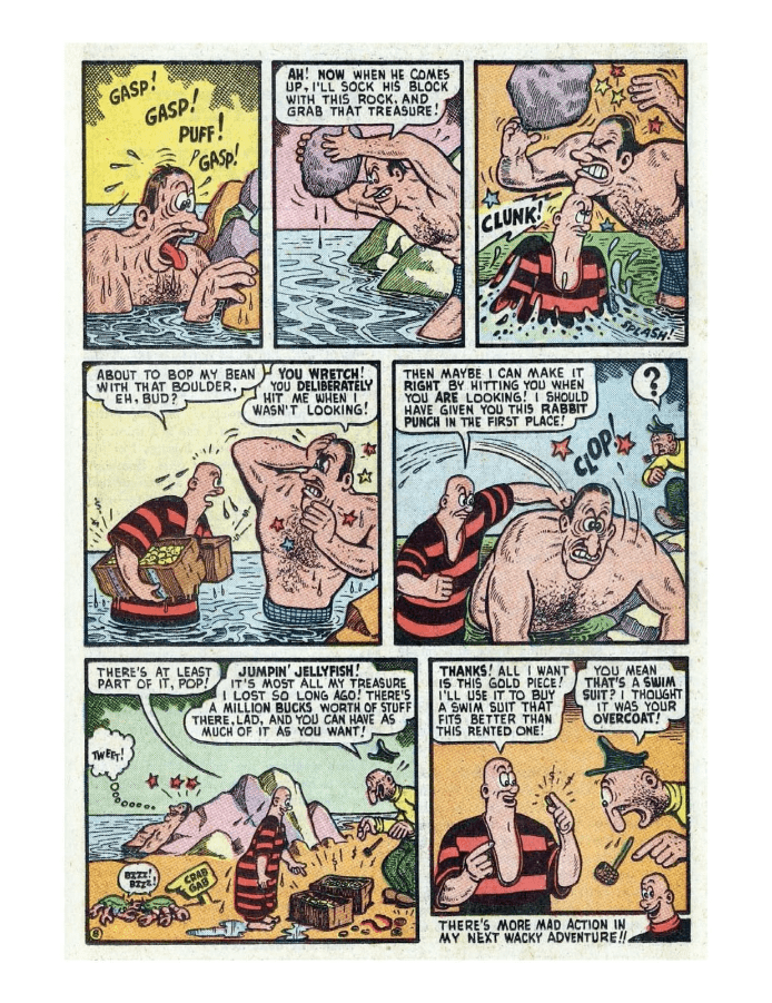 Comic cover of women in swimsuits. A comic scene with a giant rock monster and people reacting. A comic strip featuring a mischievous character causing chaos with a cat and a dog. A comic strip shows a boy interacting with a large, talking fish. Comic panels showing a man slipping on ice and falling near a car.